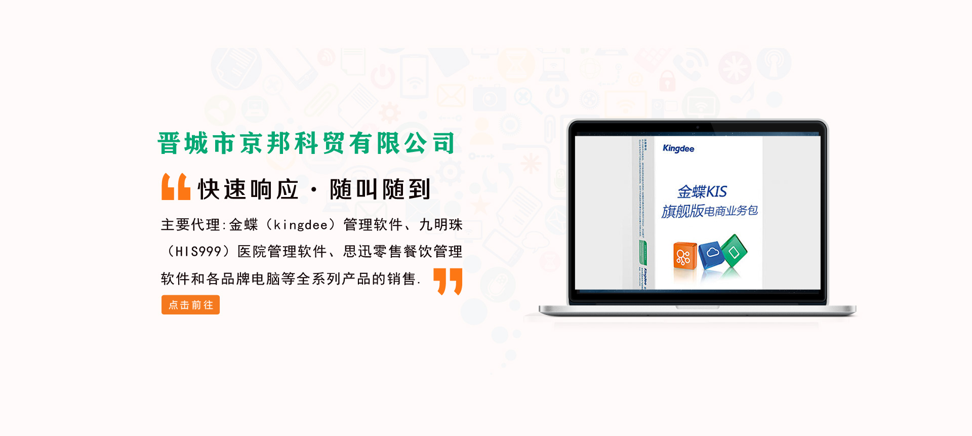 晉城市京邦科貿(mào)有限公司成立于2006年,是經(jīng)晉城市工商行政管理局登記注冊(cè),主要從事軟件銷售、電腦銷售和企業(yè)管理咨詢等相關(guān)業(yè)務(wù),是金蝶軟件(中國(guó))有限公司、深圳九明珠信息科技有限公司、深圳萬(wàn)國(guó)思迅軟件有限公司在晉城地區(qū)高級(jí)代理商,主要代理金蝶(kingdee)管理軟件、九明珠(HIS999)醫(yī)院管理軟件、思迅零售餐飲管理軟件和各品牌電腦等全系列產(chǎn)品的銷售。